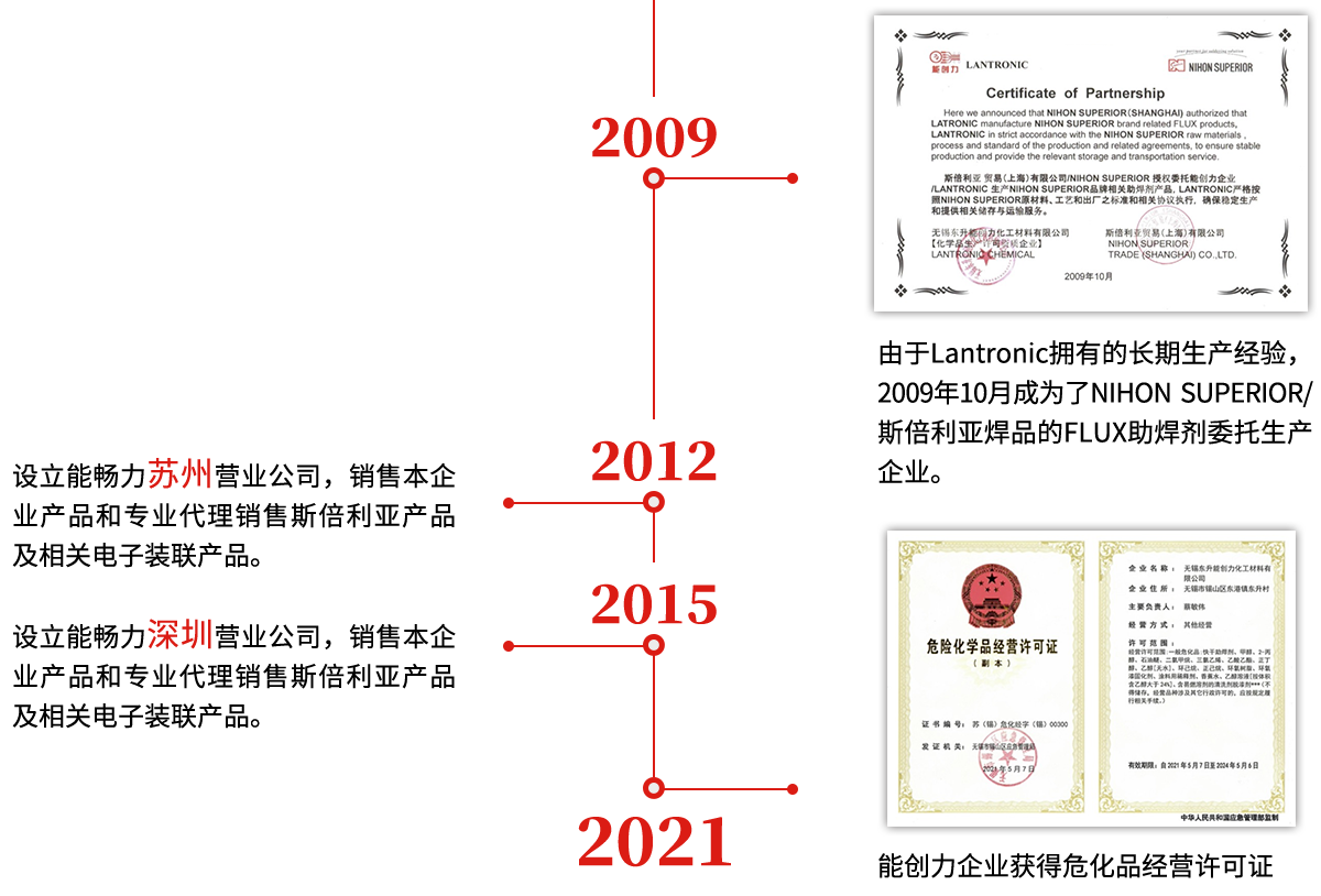 Wuxi Lantronic 能創(chuàng)力公司具有化工行業(yè)的生產(chǎn)許可(蘇)WH安許證字【B00431】,引進(jìn)吸收,技術(shù)研發(fā),各類(lèi)低固態(tài)免清洗FLUX, 水溶性FLUX,滿(mǎn)足電子裝聯(lián)企業(yè)以及高可靠性的軍工(航天)產(chǎn)品,長(zhǎng)期應(yīng)用業(yè)績(jī)。滿(mǎn)足更安全,高清潔度要求的水基助焊劑FLUX正不斷的獲得客戶(hù)的認(rèn)可,同時(shí)在清洗劑Cleaner 方面,擁有環(huán)保型產(chǎn)品和更安全的水基型清洗劑。由于Lantronic擁有的長(zhǎng)期生產(chǎn)經(jīng)驗(yàn),2009年初成為了NIHON SUPERIOR的FLUX委托生產(chǎn)企業(yè)。